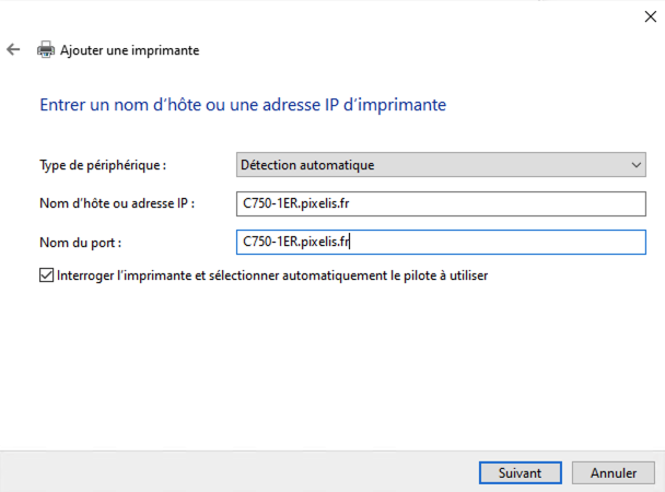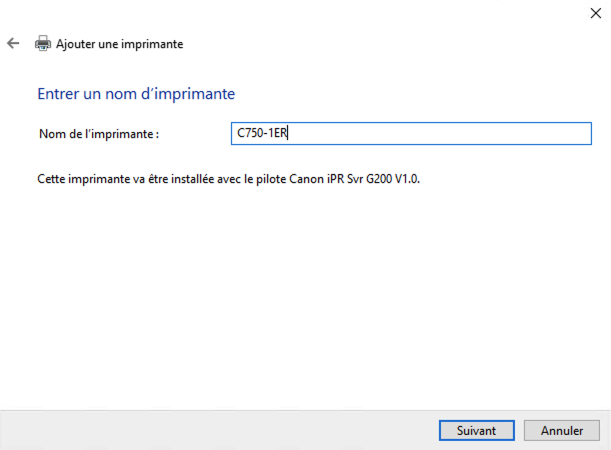 Dans chacune des fenêtres suivantes, remplacer le texte « C750-1ER » par « C165-RDC » ou « V700-1ER » en fonction de l’imprimante à installer.